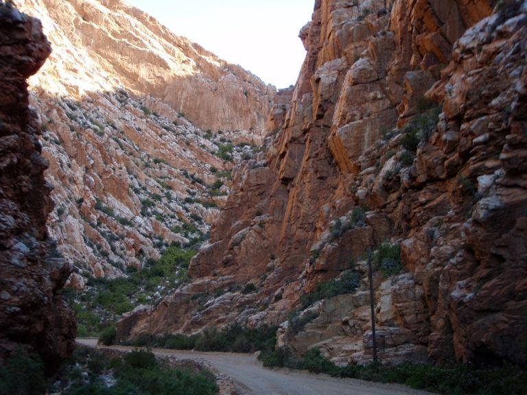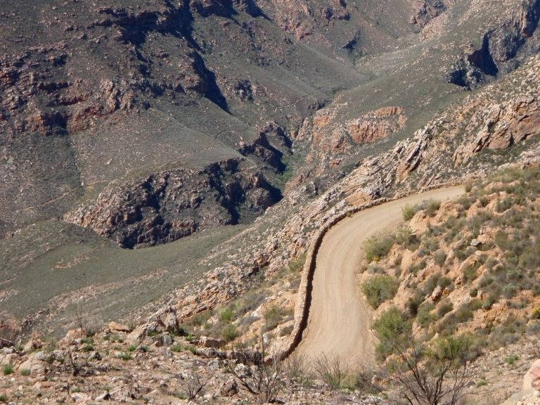 The road from Outsdhoorn to Prince Albert via the Swartberg Pass is a fantastic trip back in time. Shortly out of Outsdhoorn you can divert to the pass via gravel roads. The pass was built in the 1850s by a convict gang under the supervision of a road building engineer named Thomas Bain. It is a single track road, with dry stack rock revetement walls built so that farmers could get there goods to market by ox wagons. Bain didn feature too many switchbacks (although there are unavoidably a few) so it is a long climb along the flanks of some majestic mountains winding in an out of the draining gullies along the flanks. The road is very narrow and you can encounter the odd bit of traffic so you must be constantly aware of speed. There are a number of swales built in to stop rainwater from draining directly down the road and eroding the surface. They present like large speed bumps so caution is required. The road leads over the pass through a fantastic gorge with many spots to pull out and admire the view. We had an encounter with a Cape Cobra that my wife will never forget....the lead bike drove around but very near what looked like a stick on the road and by the time we got level with it we watched it coil up and turn back and flare the distinct hood. As we passed, the snake struck at us going by on the bike. Fortunately, we zoomed buy untouched, partly because my wifes legs were wrapped around my head as she reacted to the cobra strike! No harm done and some nervous laughter later on. The views were amazing and after a couple of hours you arrive in Prince Albert where some trendy coffee shops will serve you some refreshments. We did the return route on the same day and enjoyed it as much going back to Outsdhoorn as on the way over to Prince Albert.