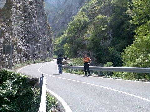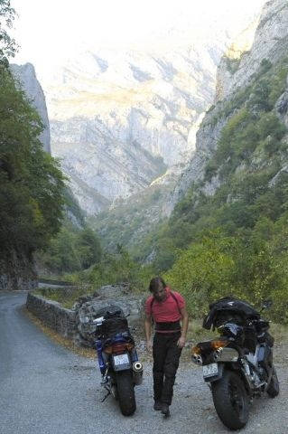 I was having a whale of a time straightening the bends out till one of our group was pulled over for crossing (not overtaking) on a white line. The thing that got me was that the police car (travelling in the opposite direction) turned round on a very narrow road and came flying up with blue lights flashing to pull us over... They obviously take the white lines very seriously! Spot fine was 80euros in cash. Two other things to look out for. In the Picos when it rains it's like riding through fog - very slow progress especially at altitude. You do come across cows, pigs and donkeys in the carriageway - and what they leave on the road can be very slippy... Some of the bridges over the river can take you by surprise - road looks straight and then suddenly dives off to the left. Eeek! Bridges themselves can be narrow and slippy. But the route is absolutely spectacular. A feast!