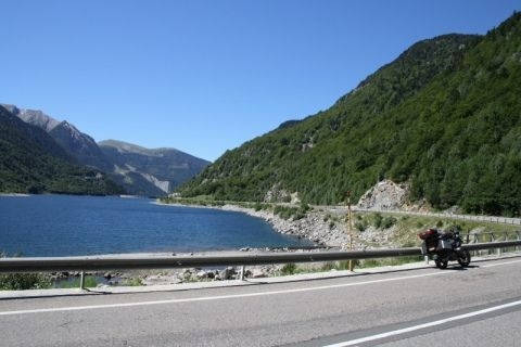 13 short tunnels through rock in quick succession, a mountain reservoir gives an interesting view. The road then calms down a bit before running along another reservoir and through a 4km tunnel, then down to Vielha. A pretty amazing road in all.