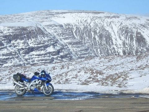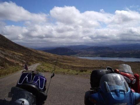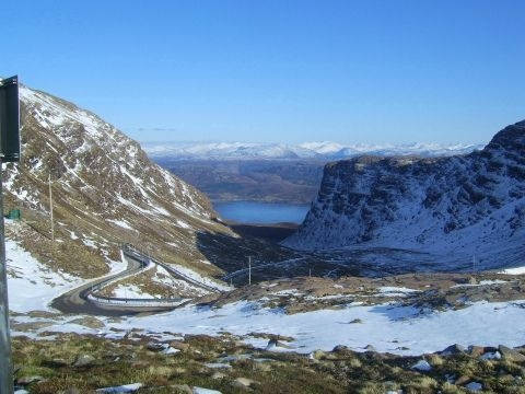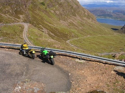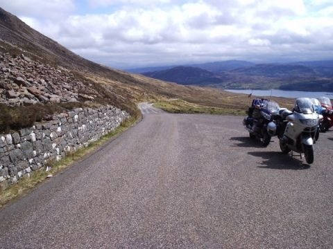 This is the highest classified road in Britian with spectacular views from the summit.From Lochcarron head west through Kishorn to the junction at Tornapress,turn left and start heading up the hill,dont take the left turn down to the old oil rig construction yard about a mile along the road.The road starts to climb from here for the next 6 miles,its all single track with some nasty blind corners but also some lovely sweepy bends.there is a good spot to stop for pics on a sweeping right hand bend above the oil rig yard with a great view over Loch Kishorn to Plockton and the Skye bridge.continue climbing up to the hairpin bends,can be tricky early in the year because of gravel and muck left on the road after the winter.Stop at the top hairpin and look back down the corrie at the view.Its about another mile to the summit with a big stopping place,if its a clear day the views are fantastic accross the inner sound to Raasay and Rona,south to Rhum and Eigg and all the way north to Lewis.From here on its down hill all the way to Applecross for 6 miles,again watch some of the corners for gravel and one nasty open left hand bend about half way down with an adverse camber which has caught out a few bikers.When you get back down to sea level you can turn left for the Applecross Inn ,good food and biker friendly,there is also a shop and prtrol station or you can go right and take the coast road round to Sheidaig to complete the loop.there are some spectacular views of the Torridon mountains,loch Torridon and loch Sheildaig.The road is quite demanding in places but well worth the efort but try to pick a clear day to take advantage of the fantastic views.