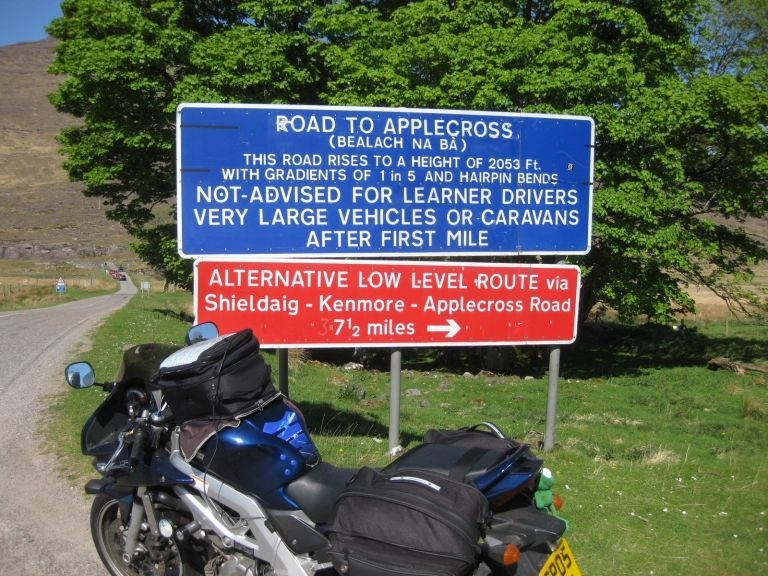 As some of the previous reviews have stated this is a must do road for all bikers at least once, has a bit of eveything to keep your interest up. Scenery is outstanding but the route itself can seem daunting for novice or nervous riders. A few very tight bends and although very remote and rural, well travelled full of bikes, bicycles and campervans/caravans, so can be quite busy. Most drivers will give way for the bikes to pass and obey the passing places but dont take it for granted! Mid week on a clear day to get the best of the road, an experience not to forget.Getting to Applecross feels like you have just completed a great expedition, great feeling. Fully luggaged sports bikes - dont be too proud to put your feet down on a couple of the bends and watch for loose gravel. Plenty of photo opportunities on a clear day and usually plenty other bikes to meet up with.